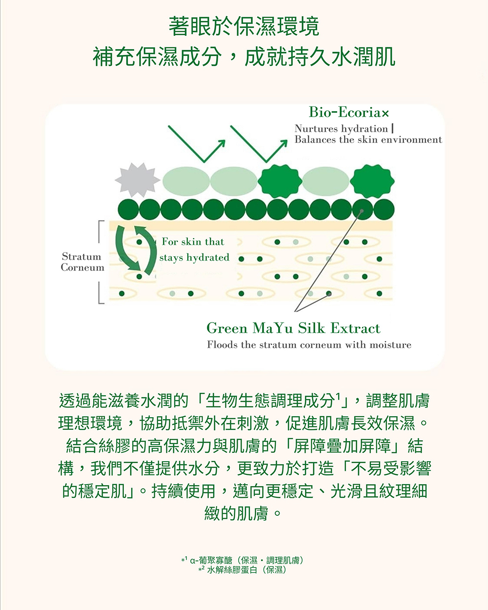 全新登場的「綠蠶絲肌底修護面膜」,專為守護並調理肌膚屏障而生。本品奢華注入珍稀綠繭萃取絲綢成分(水解絲膠蛋白),其結構仿若肌膚原生NMF(天然保濕因子),能深度灌注豐沛水潤。更復配玻尿酸¹、菸鹼醯胺等保濕活性成分,協同改善乾燥、毛孔與暗沉³困擾,由肌膚底層²啟動調理,逐步構築不易流失水分的鎖水環境。