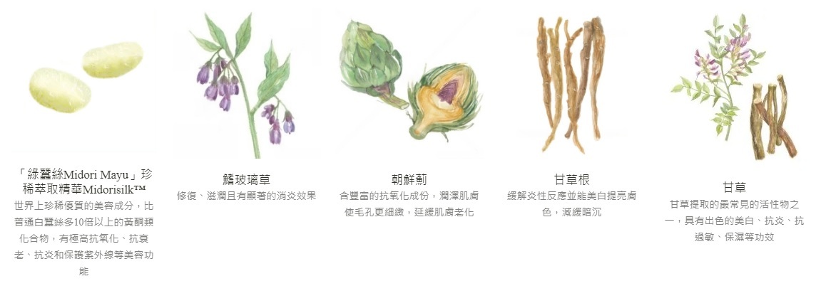從大自然尋找答案,使用珍稀優質的「Midorisilk™再生綠蠶絲精華萃取」為主要成分,配合最上等優質的植物性草藥材料,糅合日本先進護膚科技作為活膚配方。不會引起粉刺。不致敏。產品經過皮膚科醫生測試。產品不採用殘忍的動物測試。
