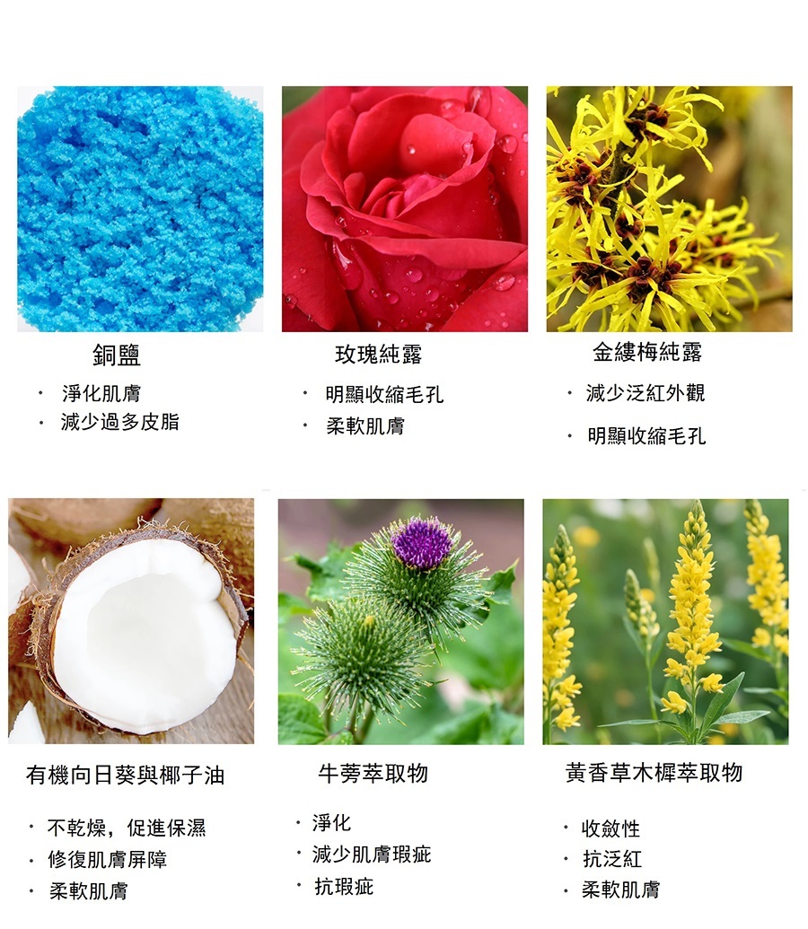 水、洋薔薇花水、甘油、金縷梅葉水、丙二醇、椰油基葡糖苷、油酸甘油酯、卡波姆、椰油醯胺丙基甜菜鹼、黃原膠、苯氧乙醇、椰子醇、椰油醯谷氨酸二鈉、辛酸 / 癸酸甘油三酯、氫氧化鈉、椰油醯谷氨酸鈉、吡咯烷酮羧酸銅、香精、蔗糖月桂酸酯、乙基己基甘油、谷氨酸二乙酸四鈉、檸檬酸、牛蒡根萃取物、黃香草木樨萃取物、山梨酸鉀、苯甲酸鈉、生育酚、氫化棕櫚甘油酯檸檬酸酯、卵磷脂、抗壞血酸棕櫚酸酯