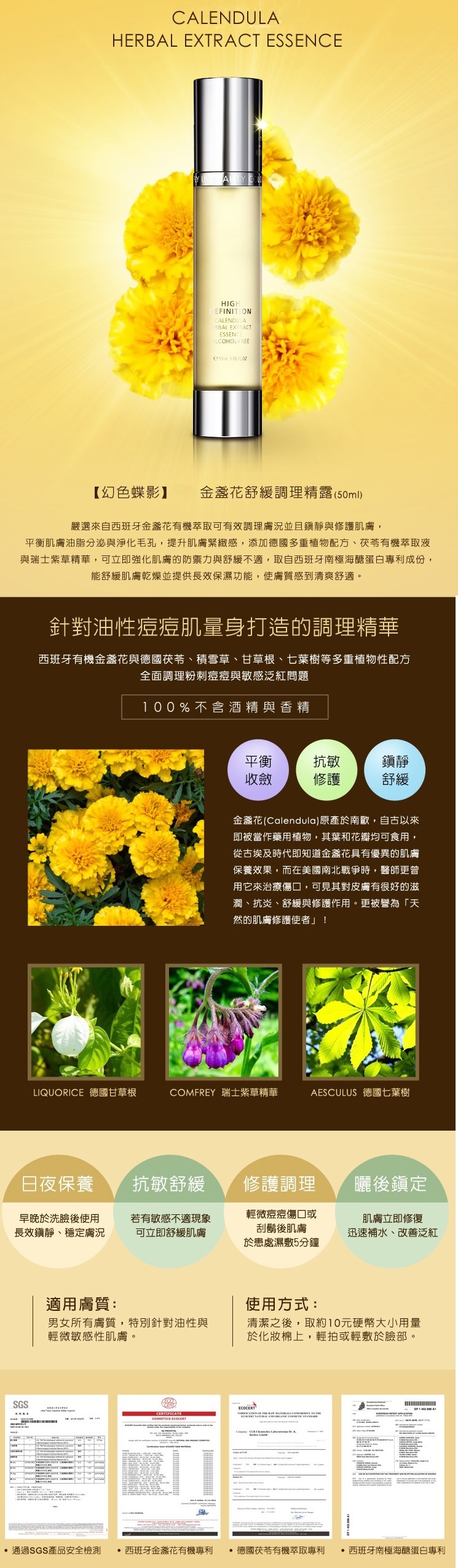 • 嚴選西班牙金盞花有機萃取可有效調理膚況並且鎮靜與修護肌膚,平衡肌膚油脂分泌與淨化毛孔,提升肌膚緊緻感,添加德國多重植物配方、茯苓有機萃取液與瑞士紫草精華,可立即強化肌膚防禦力與舒緩不適,取自西班牙南極海醣蛋白專利成份,能舒緩肌膚乾燥並提供長效保濕功能,使膚質感到清爽舒適。