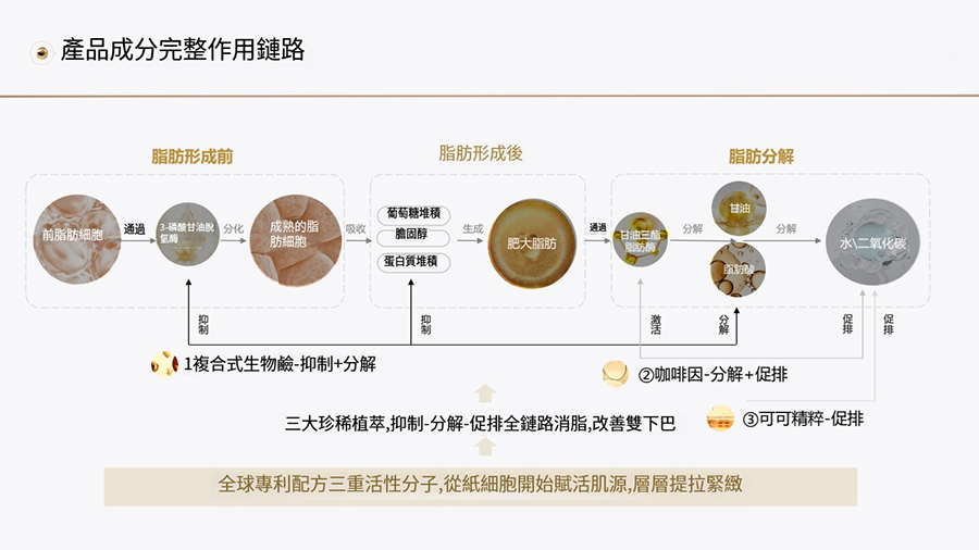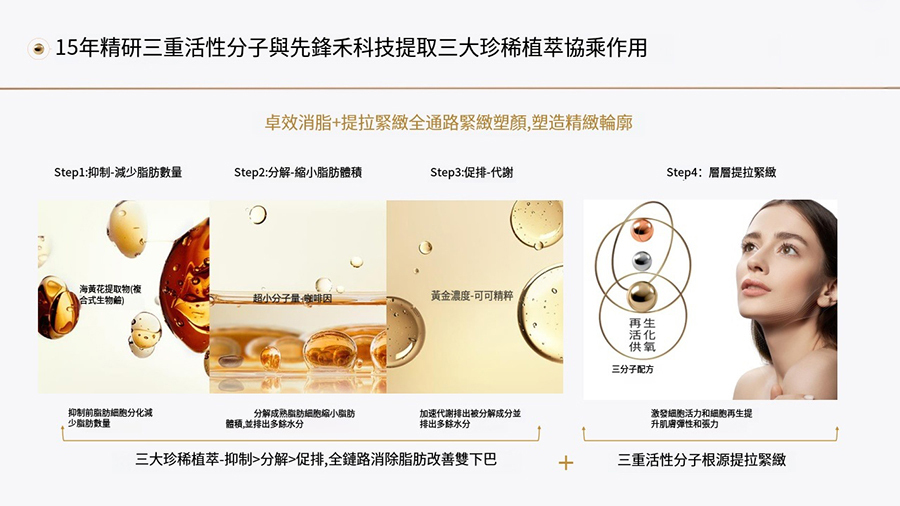 透過作用於初期脂肪細胞和脂肪細胞的代謝,它能明顯降低雙下巴的脂肪量並使外觀變小。這是一種用於縮小、緊實、平滑、並重塑臉部輪廓的活性分子。
