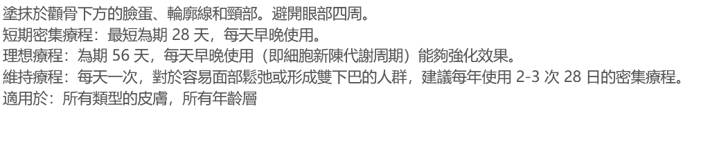 高濃縮精華液,可有效對抗雙下巴和皮膚緊實度的鬆弛。適合所有皮膚類型和所有年齡層。
