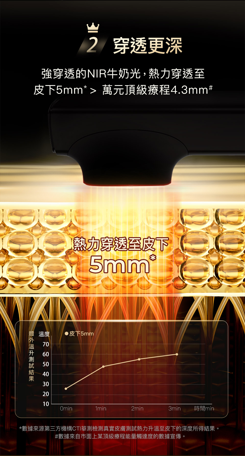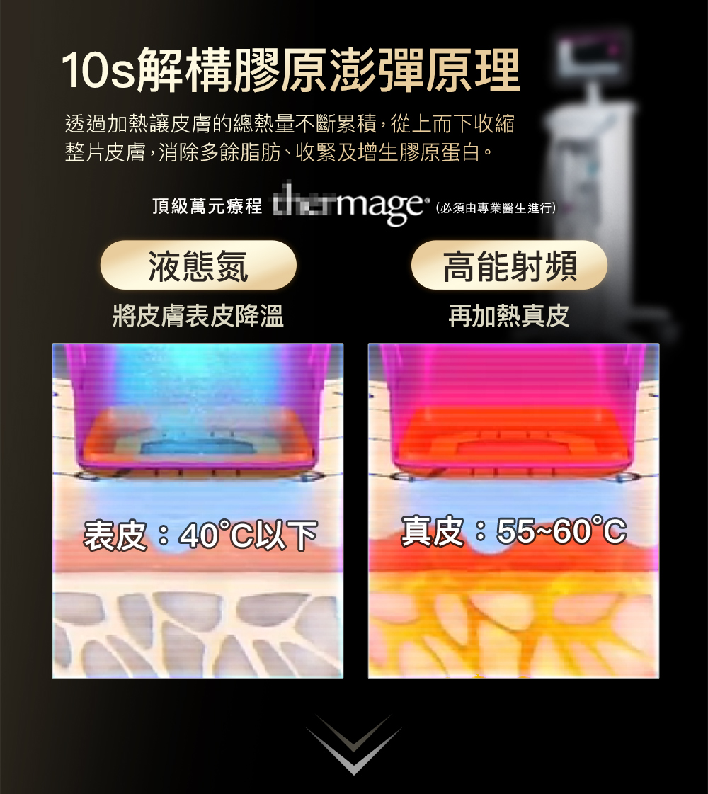 透過創新的真皮高溫與表皮冷凍技術,將真皮層迅間加熱至55至60度,極限激活膠原蛋白再生;同時以半導體原理冷卻表皮保持在40度,讓你的肌膚在無損傷的情況下煥發光彩、重塑輪廓。