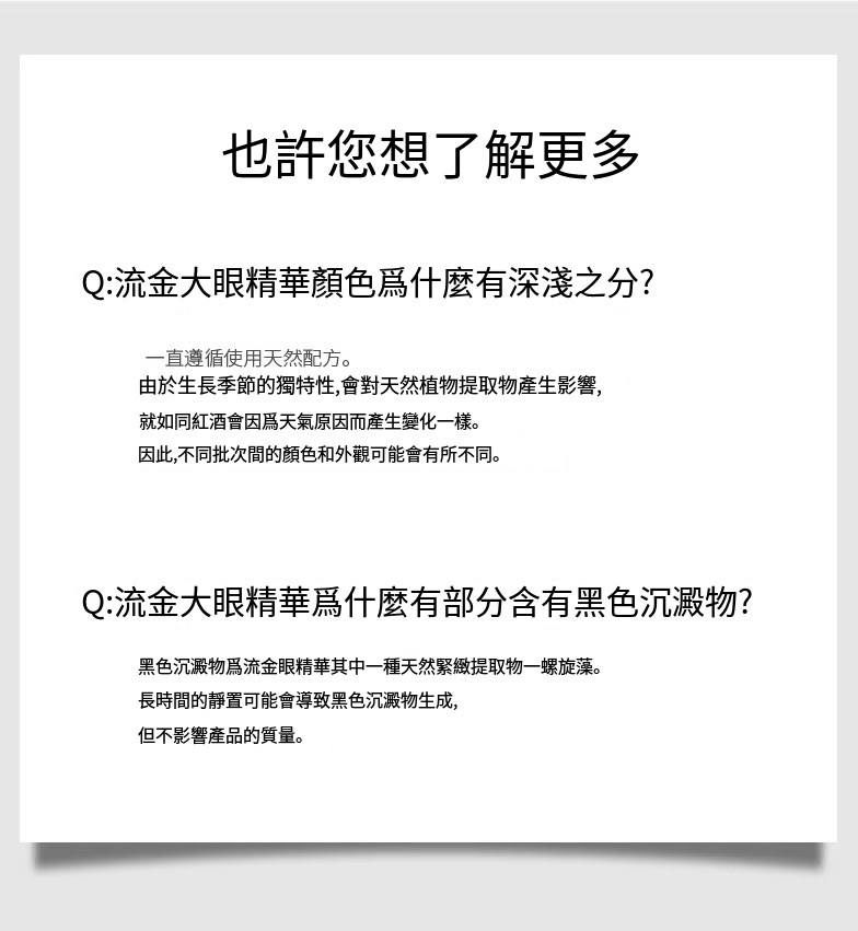 我們的產品含有高濃度的天然萃取物,因此,產品的顏色和外觀可能會因批次不同而有所差異,這就像釀酒葡萄會因年份不同而有所變化一樣。