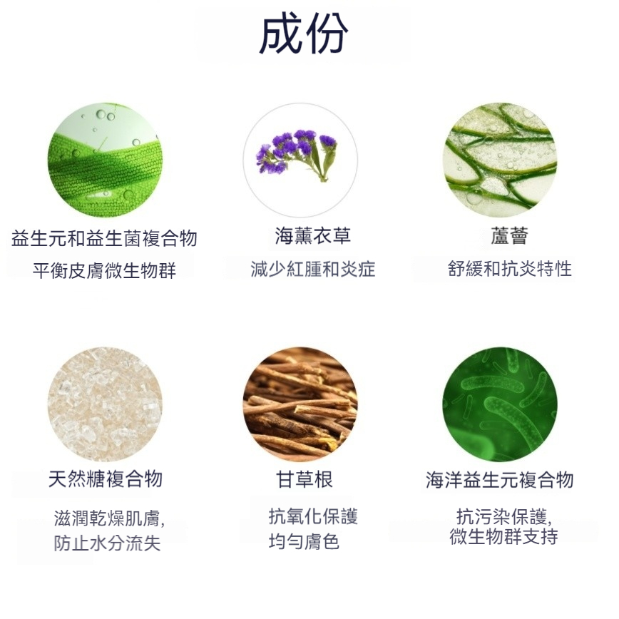 天然益生元和益生菌複合物由來自玉米和紅菜頭根的α-葡聚糖低聚糖、來自雪蓮果草莓根的100%純果汁和乳杆菌(乾酪乳杆菌、嗜酸乳桿菌)益生菌組成。複合物富含胺基酸和低聚糖,可雙重保護皮膚微生物群,减少紅腫和刺激。